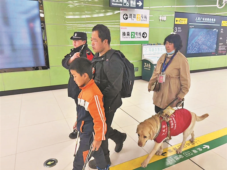 1日14时许,人民广场站上演温馨一幕:两名视障人士携一名儿童及导盲犬乘坐地铁时,车站工作人员全程贴心护送。