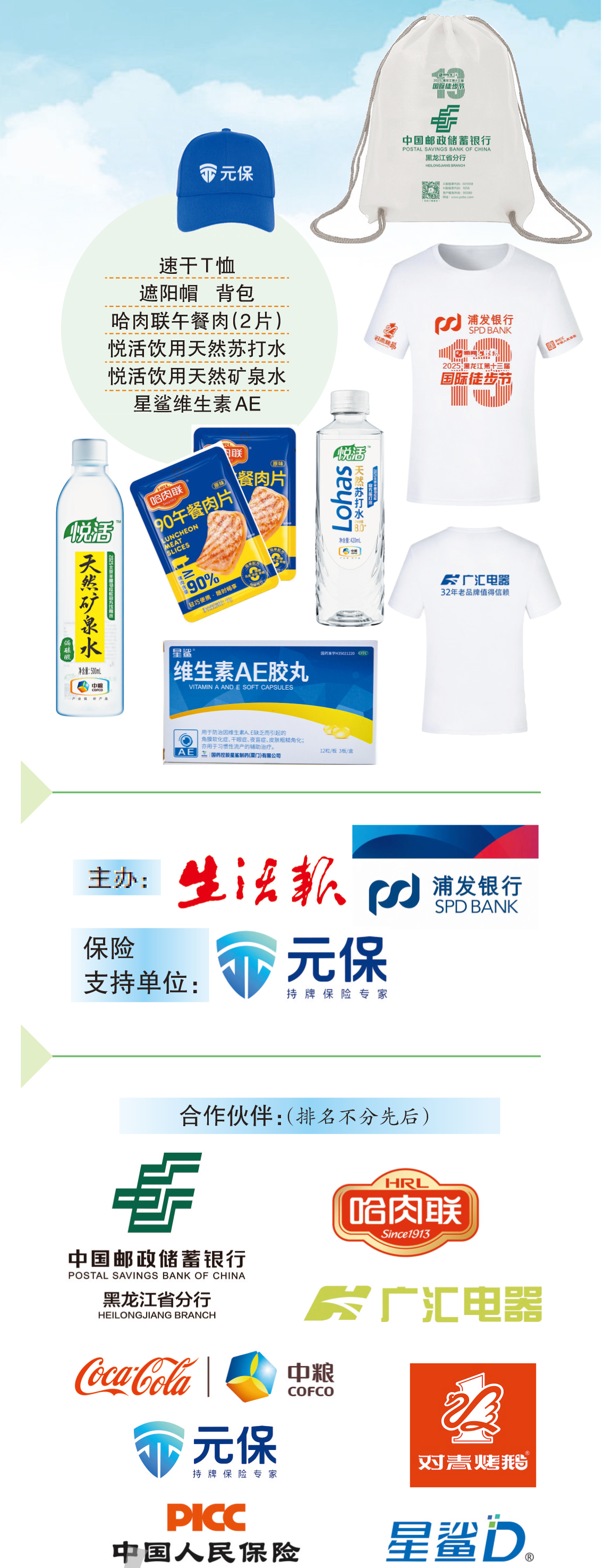 生活报讯 (见习记者王艳 记者陈莹) 浦发银行·2025第十三届黑龙江国际徒步节报名工作结束在即,活动报名结束后,将于9日10:00起,向报名成功的团队及个人发放徒步装备。装备发放将持续三天时间,分别是9日、10日、11日,每天领取装备的时间是10:00—16:00。