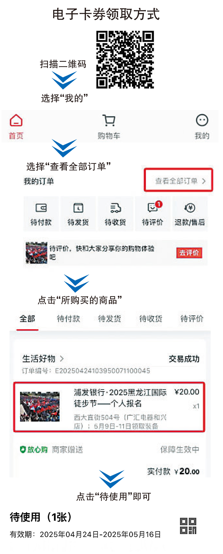 此次徒步节装备发放地点设立在市区内6个广汇电器门店,个人参与者在报名时均选择了领取装备的地点,前往报名时选择的领取地点,出示电子卡券领取即可;团队参与者由队长在指定地点领取团队装备,具体领取地点请各位队长等待通知即可。领取装备,这份电子卡券的查询方法请收好!
