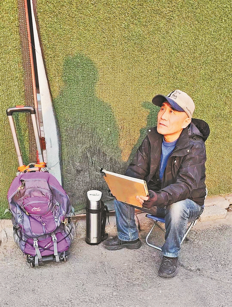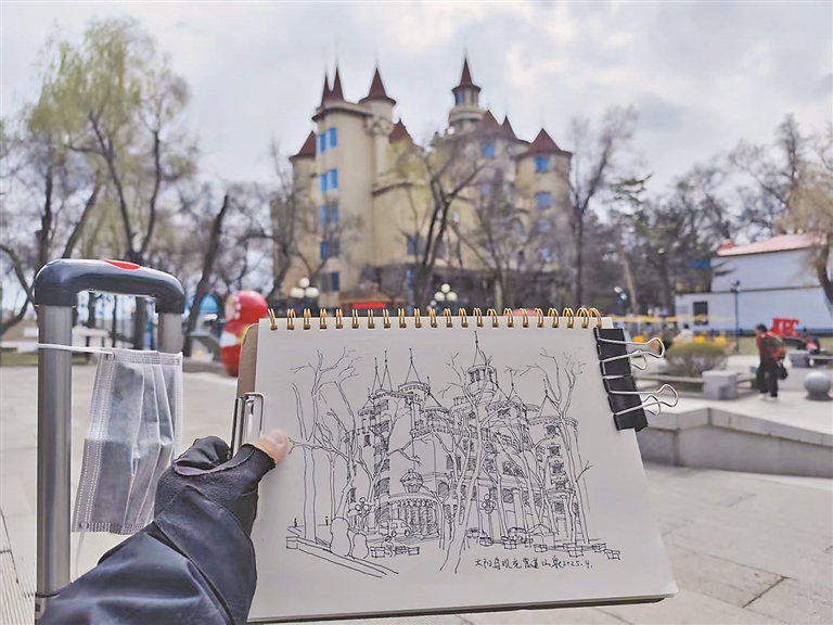 缥缈的云朵、丰茂的树林、静谧的江水……从巴洛克风格的雕花窗棂,到拜占庭式穹顶的轮廓弧线……他总能在哈尔滨的老建筑中捕捉到最动人的线条,然后将其特有的韵味定格于纸上。“五一”假期,到太阳岛上度假游玩的人们经常会偶遇一位60多岁、身形清瘦的男子坐在折叠椅上,手持一支碳素笔,膝头摊着速写本,专注地勾勒着眼前的老建筑。