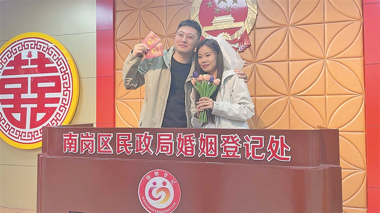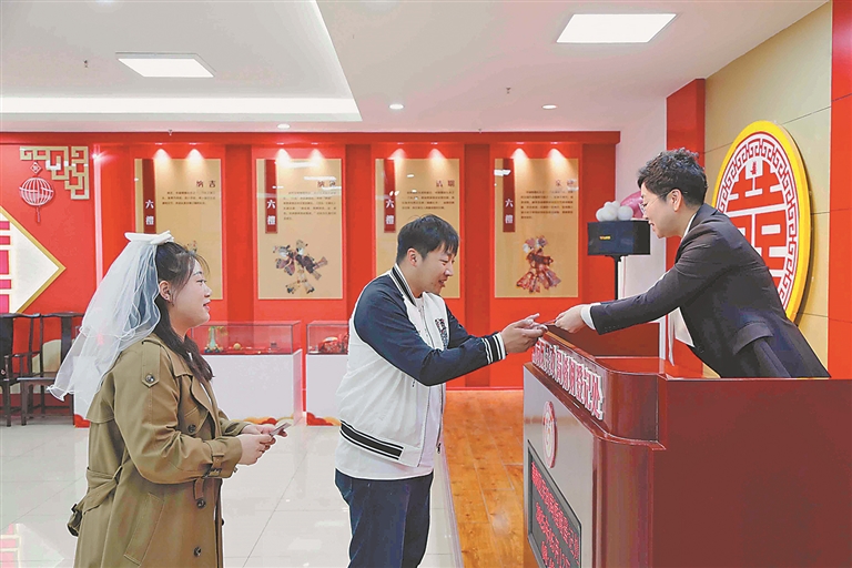 据介绍,作为全国首批婚俗改革实验区,南岗区通过数据共享平台实时核验户籍信息,彻底终结了“为一张户口簿两地奔波”的历史。12日,在登记处各办理窗口,准新人们通过预约登记填写的相关信息,持身份证即可完成全流程。