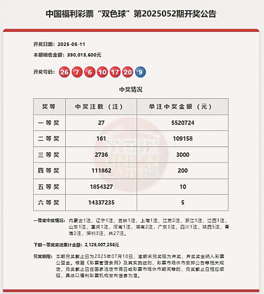 5月11日,双色球第2025052期开奖,一等奖中出27注,花落内蒙古(1注)、辽宁(1注)、吉林(1注)、上海(1注)、江苏(2注)、浙江(1注)、江西(1注)、山东(1注)、重庆(1注)、河南(1注)、湖南(2注)、广东(3注)、四川(1注)、陕西(5注)、青海(2注)、深圳(3注)。