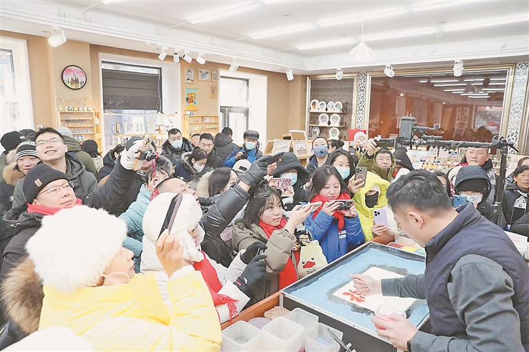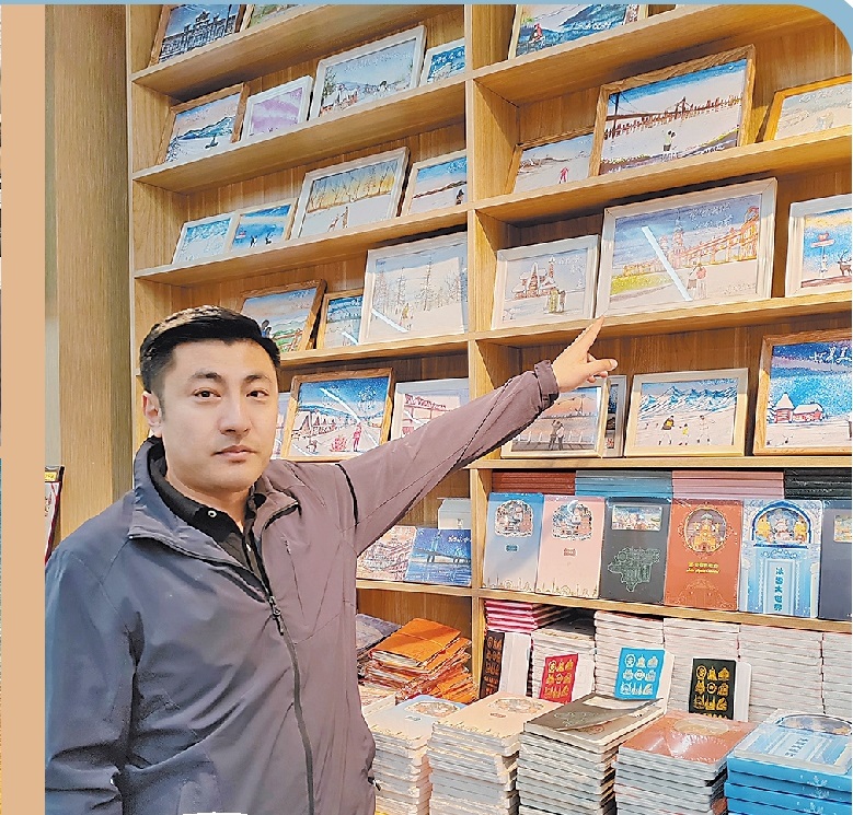 这个时候,薛以恒就开始有意识地创作以家乡为主题的沙画作品,索菲亚教堂、中华巴洛克街区、美丽的松花江,还有大美龙江……他对家乡的挚爱,都在他的指尖下栩栩如生地流淌出来,也吸引了无数游客的目光。他的“橱窗沙画秀”已经成了来中华巴洛克街区游玩的游客必打卡的一道风景。