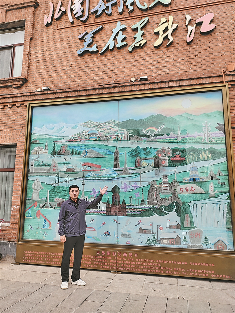 薛以恒至今最引以为傲的,也是最难忘的沙画作品,是在2023年夏天用28天时间创作的巨型彩色固态沙画《大美龙江》,这幅足有20平方米无拼接的沙画,将黑龙江十三个地市地标的四季风景尽绘其中,立在中华巴洛克街区与他店面一道之隔的墙面上,非常亮眼。“一到晚上灯光亮起,就更漂亮了。”