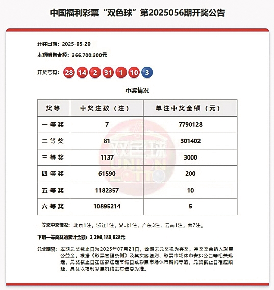 20日,双色球第2025056期开奖。一等奖7注,北京(1注)、浙江(1注)、湖北(1注)、广东(3注)、云南(1注),奖池金额22.96亿元。本期销量3.66亿元,筹集公益金1.32亿元。