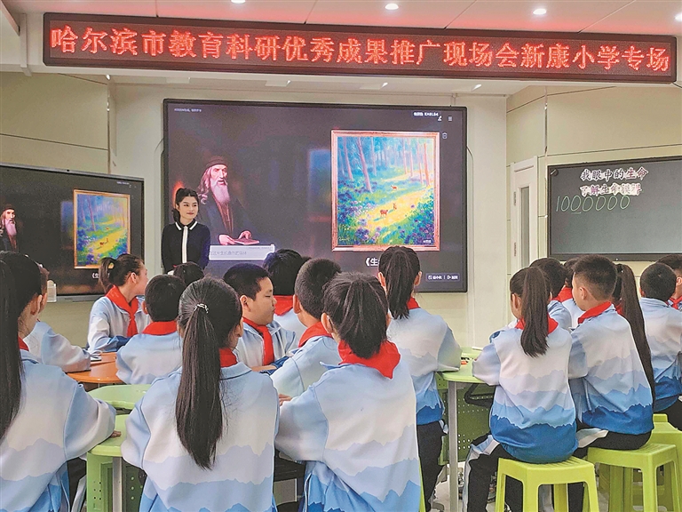 生活报讯 (记者吕晓艳 文/摄) “我们先玩儿一个热身游戏:小鸡变凤凰,来了解生命……”老师又通过AI老师“达芬奇”“李白”为学生绘画作诗,跨时空表达生命的美好。同时,老师让学生们在课堂上用A4纸画出父母的年龄,让学生学会珍惜生命。21日,哈尔滨市教育科研优秀成果推广现场会(新康小学专场)上,王悦老师讲的生命体验课《我眼中的生命》以游戏作课前热身,吸引了众多校长的目光。哈尔滨市教育研究院科研部主任李伟荣介绍,新康小学的生命教育课题是从全市4700余项科研成果中脱颖而出,获得市级精选成果奖,生命教育的方法将在全市推广。