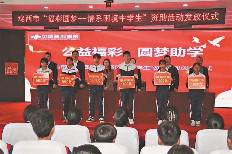 生活报讯 (记者李丹) 日前,省福彩中心2025年“福彩圆梦——情系困境中学生”资助活动拉开序幕。22日,鸡西市福彩中心在第二十五中学举行资助金发放仪式。本次活动由省福彩中心、鸡西市民政局主办,鸡西市福彩中心承办。鸡西市民政局、市福彩中心等相关单位及学校教师、受助学生和家长参加了资助仪式。