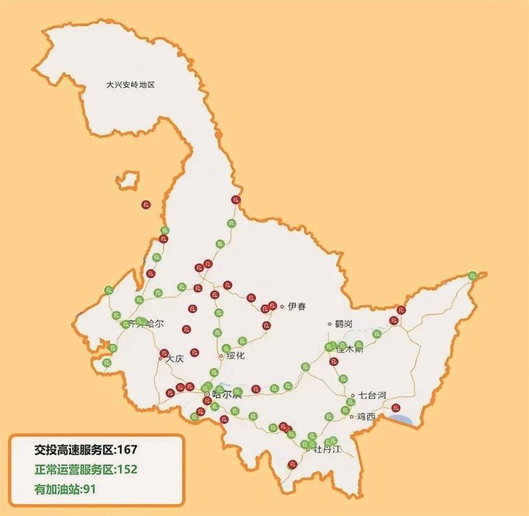 据了解,黑龙江省交投高速路网内共有服务区167处,其中正常运营152处,可提供加油服务的91处。各正常运营服务区充电设施达到100%覆盖,充电车位309个,移动充电枪72个。端午节期间,服务区客流量增幅较大,“潮汐”特征明显,易拥堵时段集中在8时-11时、14时-18时。