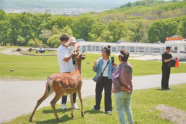为满足人们“起早踏青”的需求,端午节当天,景区把开园时间从8点提前到6点,前100名入园的游客有机会抽取荷包、五彩绳、“小鹿专属粽子”等礼品。其中,“小鹿专属粽子”是梅花鹿的“限定美食”,用它喂鹿,充满端午氛围。
