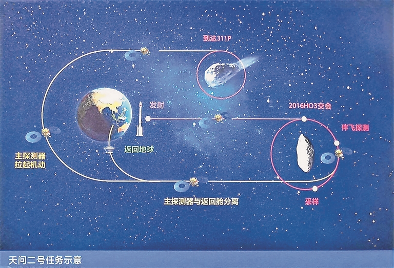 天问二号任务设计周期10年左右,主要任务目标是对小行星2016HO3进行探测、取样并返回地球,此后再对主带彗星311P开展科学探测。这是继探月、探火后,中国人在浩瀚星宇的又一次重要探索之旅。