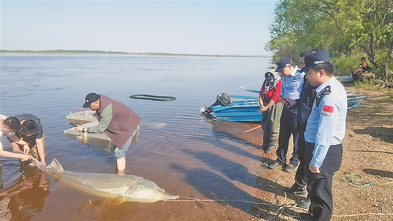 记者从黑河边境管理支队了解到,27日,支队车陆边境派出所接到渔民报警称,其在进行捕捞作业时,误捕了一条2米多长的大鱼,疑似国家保护野生动物。该所民警迅速赶赴现场,同时立即联系农业农村局、渔政等专业部门联合处置。经现场工作人员专业鉴定,这条大鱼为国家一级保护野生动物达氏鳇,系25-30年左右的成年雌性,体长2.72米,维度1.3米,体重近300斤,堪称“水中活化石”。