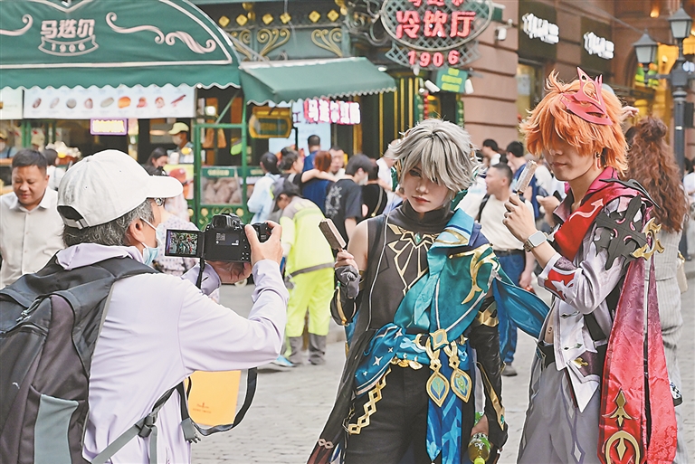 生活报 (记者王伟健 李岚 记者 丁毅 摄) 穿着汉服、马面裙的“小公主”,身着“二次元”服饰的cosplay爱好者……30日晚,在哈市中央大街、防洪纪念塔广场和斯大林公园,市民游客已开启端午节踏青的“粽”情狂欢模式。