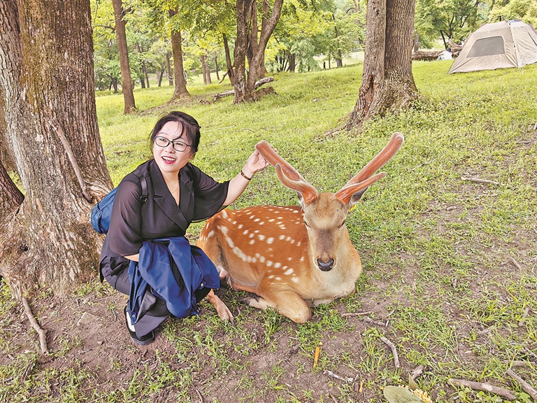 5月31日清晨,记者来到森工平山皇家鹿苑,此时这里早已被热闹的氛围所笼罩。不少家庭扶老携幼,在青山绿水间铺开野餐垫,一边品尝着美味的食物,一边悠然自得地赏景休憩。翠色欲滴的塔头海,宛如一片碧绿的海洋;文艺范十足的白桦林,尽显自然的浪漫风情,每一处都是令人心动的打卡地。而最具趣味的,莫过于与小鹿的亲密互动,温馨的画面让人倍感治愈。