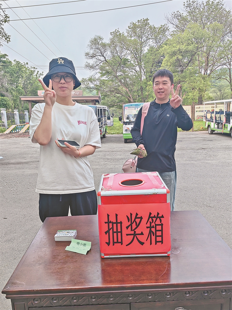 随着清晨的阳光缓缓洒下,景区已开始热闹起来,检票口处的抽奖活动正式拉开帷幕。前一百名入园的游客,成为节日里的第一批幸运儿。五彩绳、荷包、“小鹿专属粽子”等精美好礼纷纷落入他们手中。