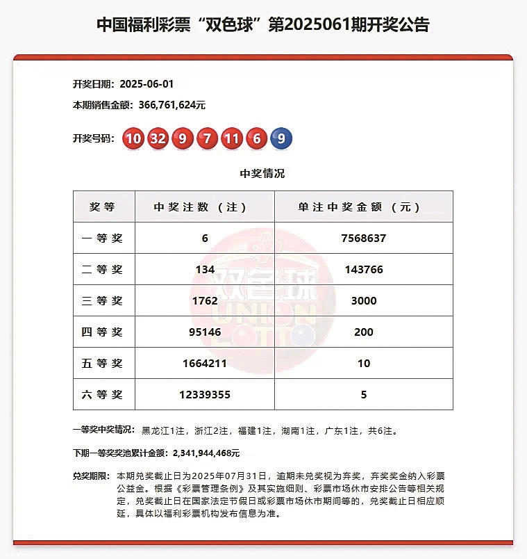 6月1日,双色球第2025061期开奖。一等奖6注,黑龙江(1注)、浙江(2注)、福建(1注)、湖南(1注)、广东(1注)。奖池金额23.41亿元,本期销量3.66亿元,筹集公益金1.32亿元。