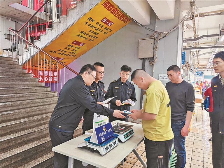 与此同时,市场监管部门在专项整治中推出“手机变砝码”便民服务,将手机放置在电子秤上,工作人员精准称重后,将对应的数值记录在特制的计量贴纸上,并仔细粘贴至手机背面,将手机变成“砝码”。通过这种方式,市民在购物时,只需将贴有标签的“手机砝码”放在商家的电子秤上,就能快速识别商家秤具是否存在计量作弊行为,切实保障市民群众“菜篮子”安全。