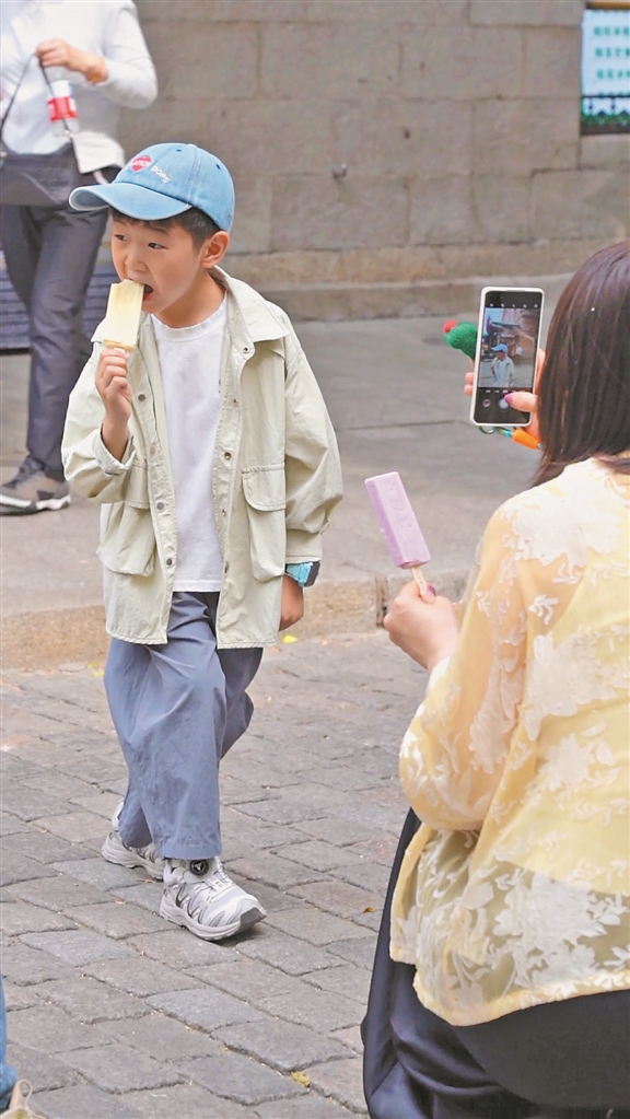 来自广州的游客陈先生咬了一口原味冰棍,眼睛一亮:“奶味比我们那边的雪糕浓多了!”他告诉记者,他是第一次来哈尔滨,出发前做攻略时,马迭尔冰棍被网友列为必吃清单第一名。“果然没让我失望,口感特别绵密,甜度也刚好。”说着,他又排队买了三支,说要带回酒店慢慢品尝。