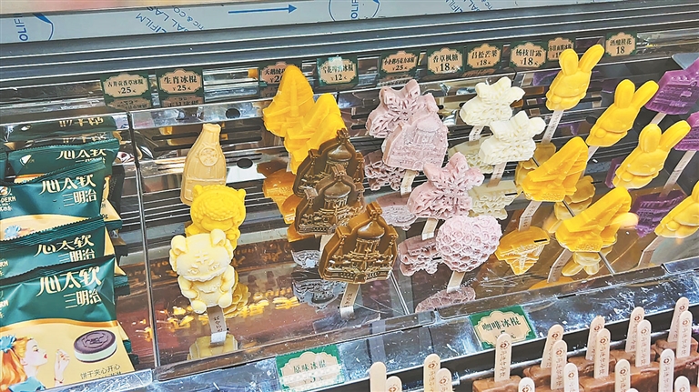 成都来的王女士带着8岁女儿正在挑选文创冰棍,最终选了小兔子造型的。“太可爱了,都舍不得吃。”小女孩举着冰棍迟迟不下嘴。王女士笑着说:“我们昨天刚到哈尔滨,朋友推荐来这儿。没想到冰棍还能做得这么精致,准备发朋友圈‘炫耀’一下。”