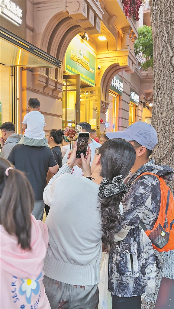 1日10时,中央大街的石板路上已挤满游客。马迭尔冷饮厅的招牌下,二十余人排成蜿蜒的队伍,窗口不时传出“原味两支”“咖啡味加香草”的点单声。一位穿红色防晒衣的年轻女孩接过冰棍后并未立即品尝,而是高举过头,招呼同伴:“快帮我拍一张!背景要带马迭尔那几个字儿!”在她身后,三名大学生模样的男生正模仿经典“雪糕举杯”姿势在自拍。