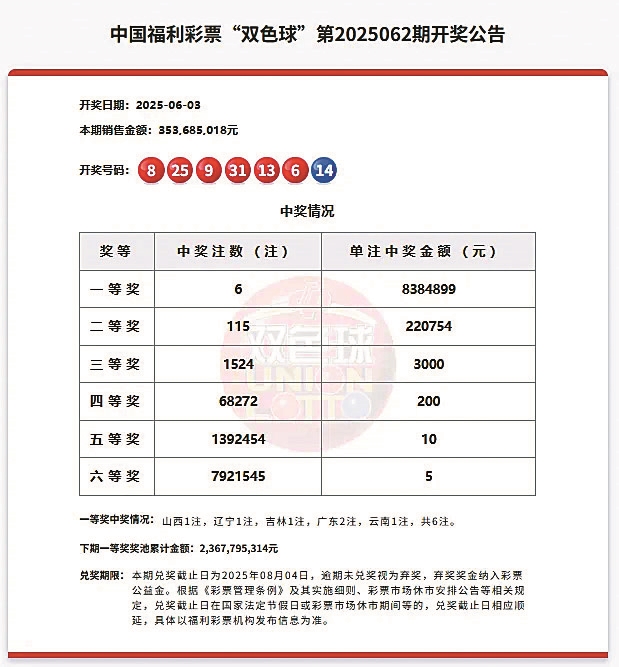 6月3日,福彩双色球第2025062期开奖,开奖号码8 25 9 31 13 6+14。一等奖中出6注,分别来自山西(1注)、辽宁(1注)、吉林(1注)、广东(2注)、云南(1注)。奖池金额23.67亿元,本期销量3.53亿元,筹集公益金1.27亿元。