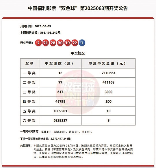 6月5日,双色球第2025063期开奖,一等奖中出12注。福建(1注)、湖北(10注)、云南(1注)。奖池金额23.77亿元,本期销量3.66亿元,筹集公益金1.31亿元。