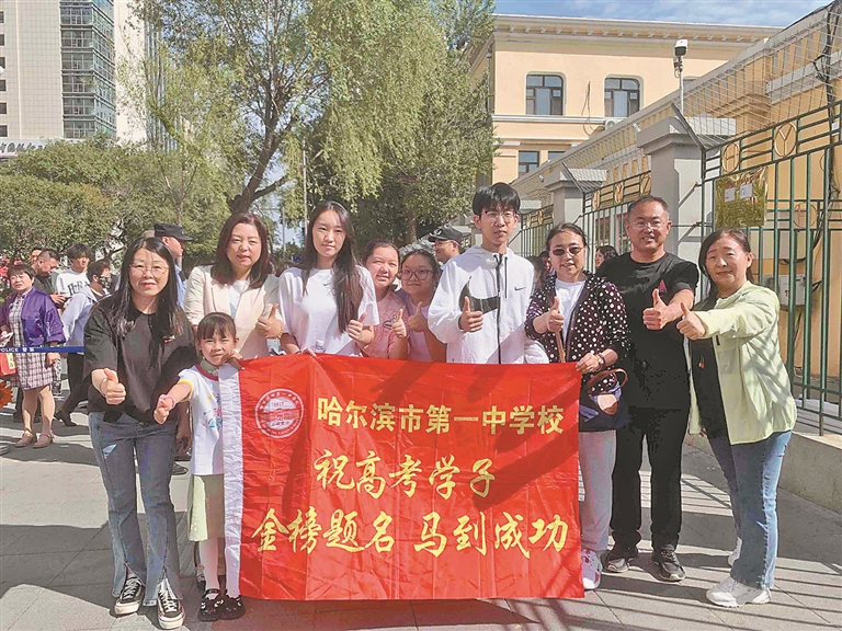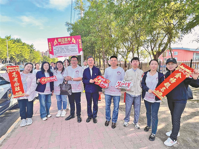 在哈市第九十五中学考点,哈市顺迈高中的高三全体教师一大早就整齐地等候在考点外,他们身着统一的送考服,手持加油横幅,热情迎接即将踏入考场的考生。“我们组成的护考方阵,就是现场激励考生!”陈佳丽老师说。“三年磨一剑,今朝试锋芒,你们定能凯旋!”一名班主任老师现场为学生送上祝福。