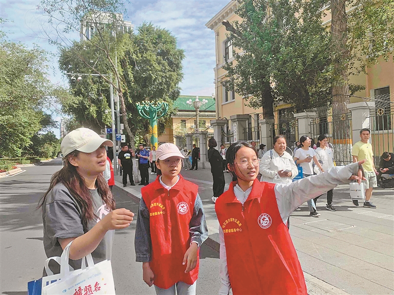 哈五中考生的家长也组团前来陪考,妈妈、姨妈齐上阵,小妹妹也没落下。“我们到现场也是给自己吃定心丸,在家里等待会感到焦虑。”现场,在工作人员的护送中,一名坐轮椅的考生被送入考场。来自哈市第107中学的小志愿者姚欣孜为市民当起小引导员。