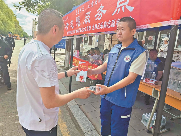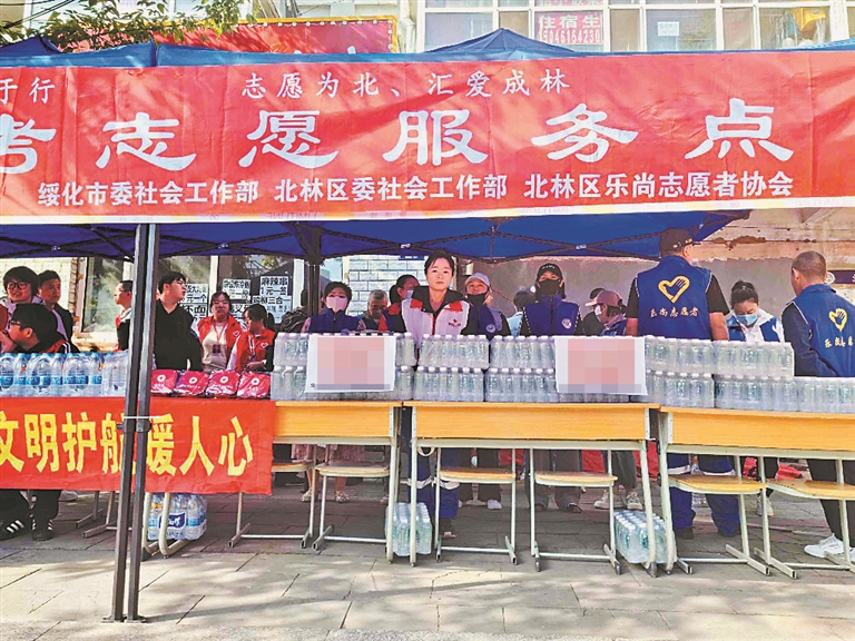除了接送考生,在绥化市委社会工作部、北林区委社会工作部的支持下,杨海涛还组织志愿者在绥化市第二中学考点搭建爱心帐篷,备齐桌椅、矿泉水、雨伞等物资,免费供考生和家长使用,并发放志愿服务宣传手册。