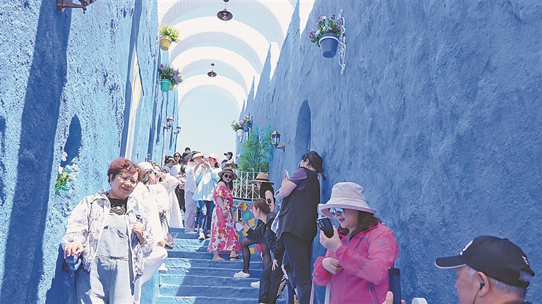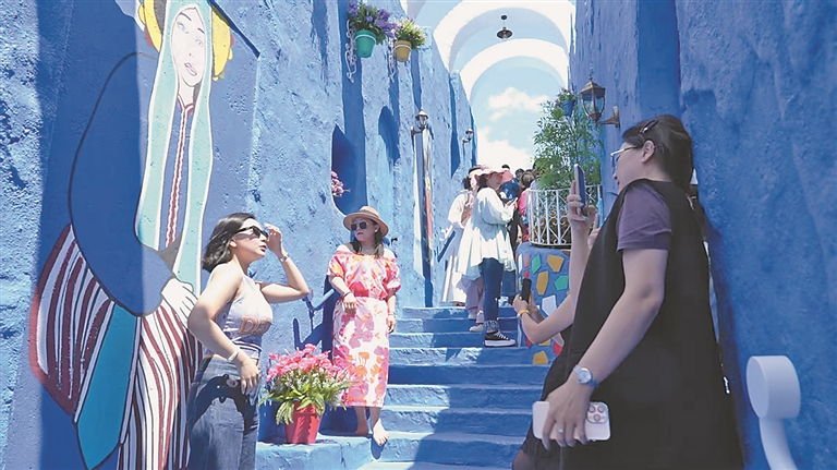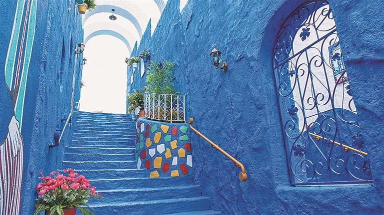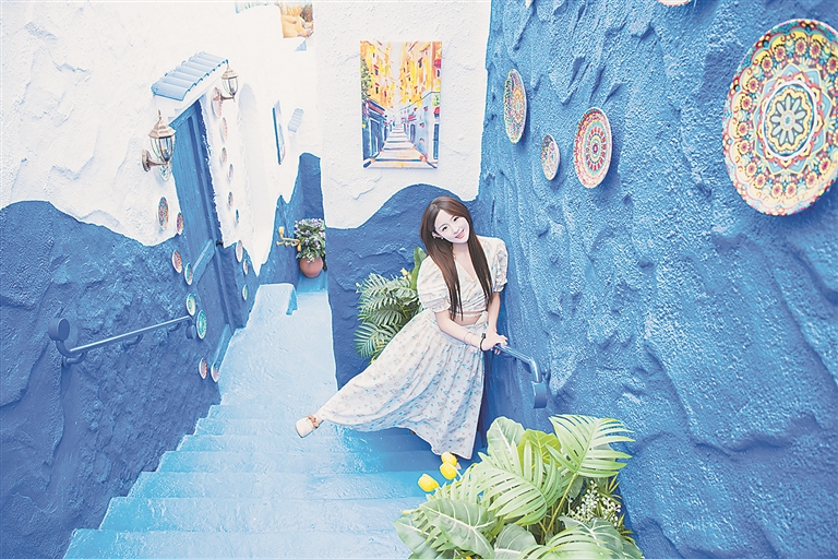 凭借线上热度,“摩洛哥蓝色小镇”在线下也迅速圈粉。6月11日,记者在现场看到,100米左右的蓝色巷道里,遍布台阶都是前来打卡的市民游客。“这里真的太美了,随手一拍就是壁纸级美照。”“仿佛置身异国他乡,每一处都透着浓浓的异域风情。”几位游客一边拍照一边夸赞。