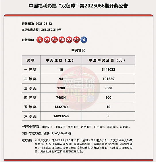 12日,福彩双色球第2025066期迎来开奖,本期中出10注头奖,具体中奖情况:山西2注、上海2注、重庆1注、河南1注、广东3注、深圳1注。本期销量3.66亿元,奖池金额24.00亿元,筹集公益金1.31亿元。