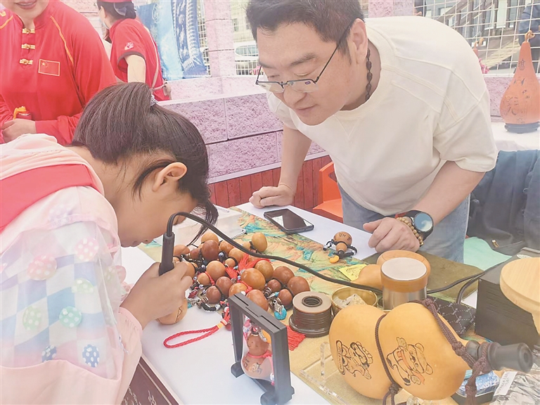 展演现场,花棍舞、古筝、太极刀、魔术等表演引发观众阵阵喝彩。大家纷纷夸赞:“多维度的展示让非遗艺术跳出静态陈列,呈现出动态的生命力。”在非遗项目展示区,麦秆剪贴、金漆镶嵌工艺、麻花布北蓝印染技艺等30余项传统手工技艺齐聚一堂,市民们不仅近距离观摩了非遗代表性传承人的精湛技艺,而且还沉浸式地参与了互动体验。非遗美食展区则汇聚了不少特色项目,传承人们现场讲解工艺流程,游客们一边品尝一边交流,感受“舌尖上的非遗”。