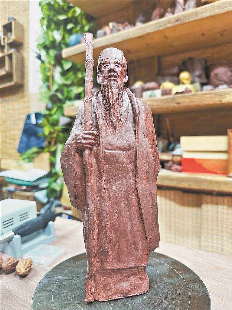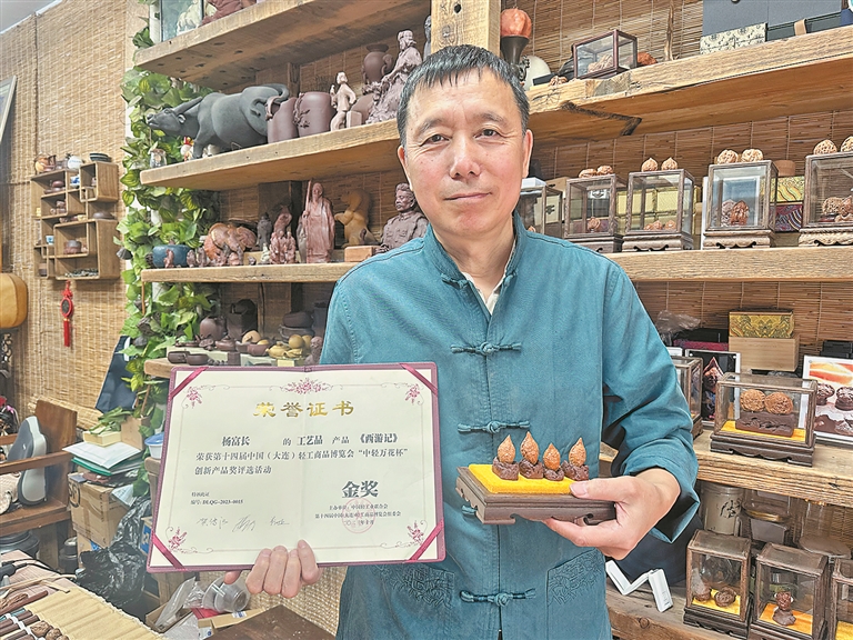 杨富长工作室的东墙博古架上陈列着核雕《节俭》,高3.5厘米的核桃上,戴着老花镜的老者指间银针引线,补丁褶皱细若发丝。杨富长说,这件作品曾获黑龙江省“创意龙江”大赛金奖。西柜紫砂泥塑《苏东坡》竹杖点地,杖头虫蛀孔由刻针刻出螺旋纹路。第十四届轻工博览会金奖作品《西游记》核雕前,总有游客举着放大镜数沙僧颈间九颗可转动的念珠。