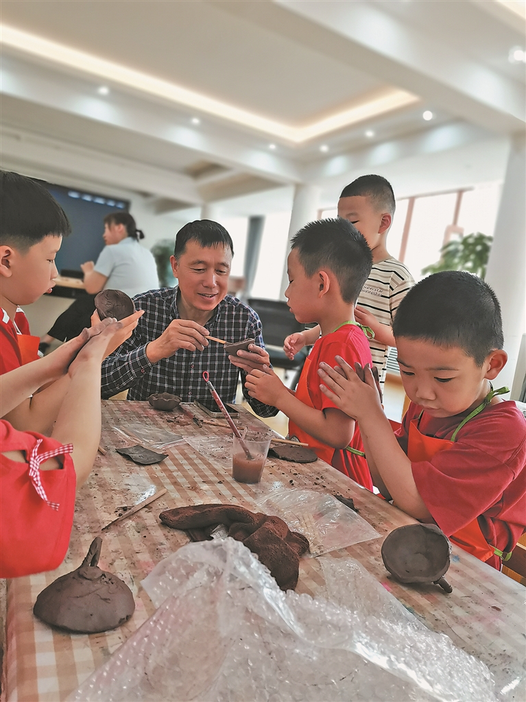 最让杨富长感到快乐的,是在幼儿园“文化润园”活动的经历。“那场面,热闹又纯粹!”他模仿着孩子们的动作,眼神发亮,“小家伙们把泥片一卷,就成了小鱼,捡根小树枝在鱼身上一压,嘿,鳞片就出来了。有个叫小雨的小姑娘,给她捏的泥兔子插了根胡萝卜当大门牙,还大声宣布要把兔牙涂成彩虹的颜色呢!”老师们也收到了凝聚心意的礼物,杯壁刻着班级名字的紫砂茶杯、书本模样的小茶宠、还有用孩子们的小手印压出来的向日葵摆件。