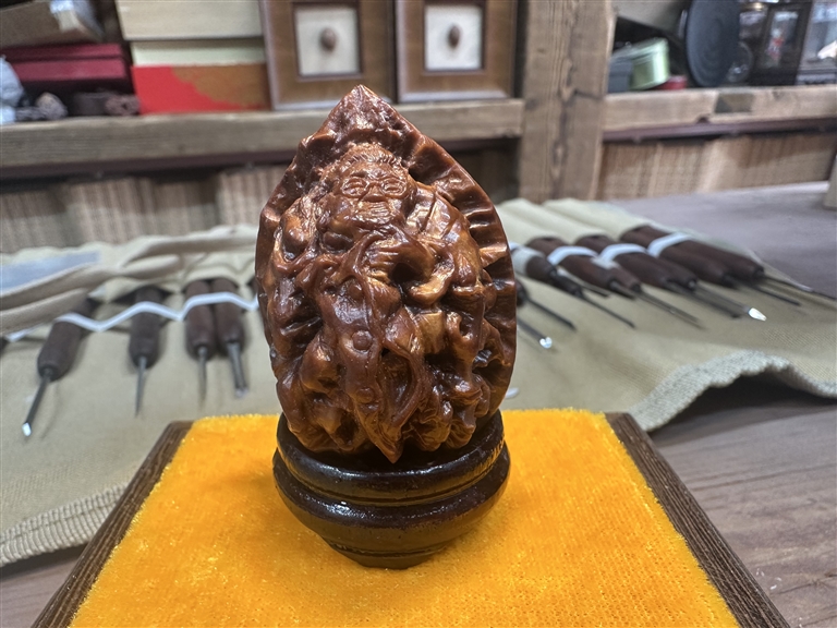 雕刻刀在核桃的坚脆表皮上跳着危险芭蕾。杨富长展示正在创作的关公核雕,青龙偃月刀卡在核桃夹缝中,刀刃厚度不足0.3毫米。“野生核桃的硬度虽不及玉石,但也很坚硬。”檀木夹具上的核桃随刻刀轻颤,“下刀重则崩裂,轻则难显肌理。”杨富长的代表作《西游记》,悟空核的金箍棒顺着果核的凌厉走势斜指上方,棒身细密的纹路清晰可辨;八戒核圆鼓饱满,恰似其憨态身形,肥硕的肚腩借核桃天然的凸起雕成,他扛着九齿钉耙,耙齿分明,咧嘴的笑容带着几分狡黠与惫懒,神情活灵活现;沙僧核显其稳重气质,佛珠串垂挂胸前,颗颗圆润分明,面容沉静坚毅,眉宇间透着任劳任怨的可靠;唐僧核袈裟的衣褶层叠起伏,顺着核桃天然的棱线自然垂落。四枚核桃独立成章,却又气韵相连,师徒四人的经典形象跃然核上,惟妙惟肖,堪称精巧。