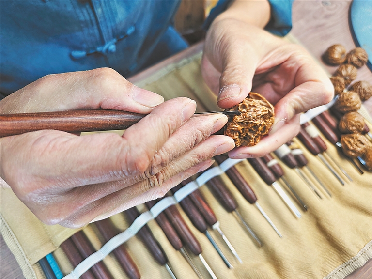 工作台右角的玻璃罐里,上百枚野生核桃拥挤碰撞,这些表皮坑洼、形状扭曲的野生核桃,正是杨富长的灵魂画布。“看这颗桃形核”,他举起20年前的作品《笑口常开》,核桃顶部凸起化作老人的光额头,螺旋纹路巧变耳廓,“当年晨练遇见的聋伯,总笑着读人唇语。”3.3厘米高的核桃上,老人的笑纹清晰可见。