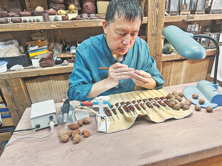 哈尔滨中华巴洛克街区的青砖拱门下,“老街泥匠”木牌在晨光中轻晃。推开十余平方米工作室的木门,野生核桃雕刻的《笑口常开》、紫砂泥塑的方志敏像映入眼帘,三面墙架上陈列的千件作品间,黑龙江省工艺美术大师证书与“创意龙江”金奖奖杯错落其中。杨富长坐在斑驳的木台前,正用刻刀在核桃凸起处勾勒出一缕胡须,他抬眼微笑道,“在这方寸之地,装着半辈子的人间烟火。”