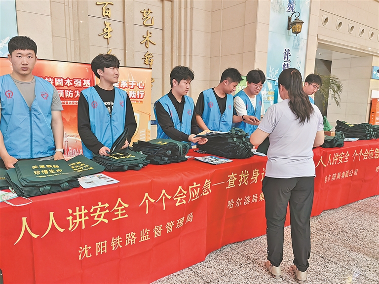 生活报讯 (记者栾德谦) 16日,在黑龙江省哈尔滨站候车厅内,20余名铁路志愿者正在为旅客讲解铁路安全知识。据悉,这是沈阳铁路监督管理局和中国铁路哈尔滨局集团有限公司共同开展的安全生产咨询日宣传活动。