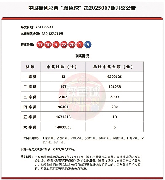 6月15日,双色球第2025067期开奖,一等奖中出13注,花落山西(1注)、吉林(4注)、浙江(2注)、安徽(1注)、湖北(1注)、湖南(1注)、广东(2注)、宁夏(1注)。