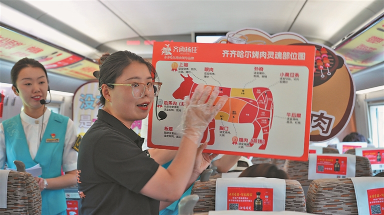 据了解,齐齐哈尔素有“国际烤肉之都”的美誉,哈尔滨局集团公司围绕齐齐哈尔烤肉美食节开幕,游客出行量攀升的情况,联合齐齐哈尔市文旅局、商务局,在哈齐高铁动车组上打造烤肉主题车厢,邀请齐齐哈尔文旅推荐官现场推介,开展家庭拌肉教学、知识问答、品鉴、赠礼等互动活动,因高铁动车组全列禁烟,齐齐哈尔文旅部门提前准备全熟牛肉制品,并用动车组微波炉加热保持牛肉原汁原味,让旅客沉浸式体验鹤城烤肉魅力。
