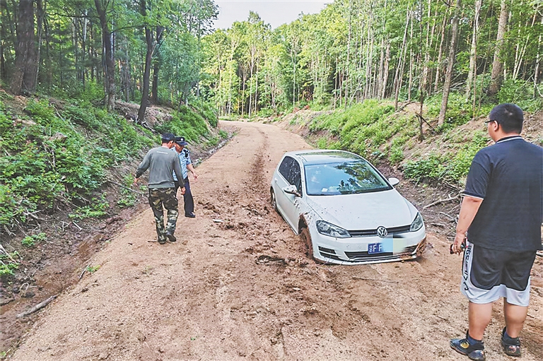 当日16时许,从北京来黑龙江探秘原始森林的一对北京小情侣,因为不熟悉地形、遭遇山路积水,车辆右前轮整个埋进泥坑,底盘直接“趴窝”。深山里信号时有时无,两人打了八遍电话才打通省林区公安局方正分局小罗密派出所的报警电话:“警察叔叔救命!深山里连信号都没有,车动不了了!”