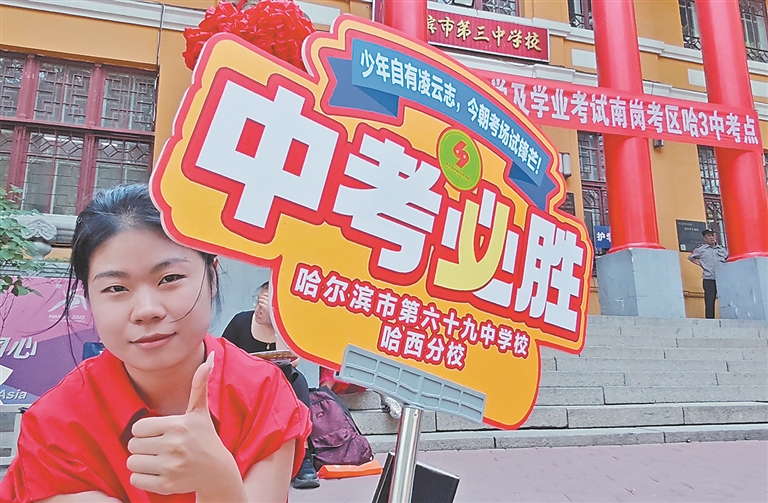 该考点门口,来自哈市第七十六中学的老师举起了学校的大旗,让本校考生能够第一时间看到。“我们学校一共有48名考生在这里考试,希望他们看到我们以后心里有底儿,考试顺顺利利。”来自哈市第三十六中学校的老师们也做足了准备:“我们给孩子准备了爱心贴,让他们充满自信奔赴考场。”除了家长老师,还有五名身穿哈一中校服的高一学生在该校门口为考生加油助威,记者了解到,他们当天是准备去参加研学活动的,正好赶上了中考。“我们也想给学弟学妹传递成功的力量!”孩子们开心地表示。