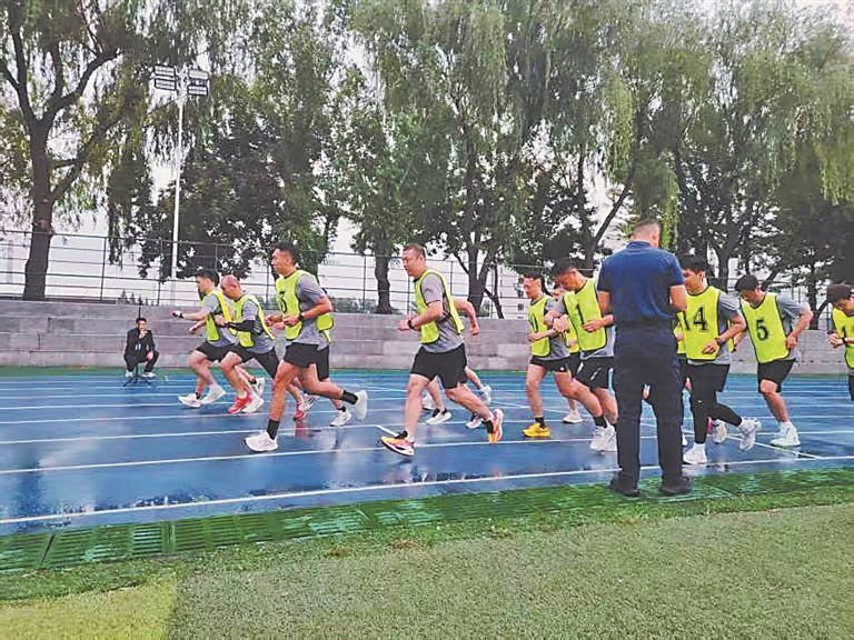 全员训练围绕力量、速度、耐力等要素,开展3000米测试,50公斤卧推,25公斤杠铃快挺等科目。