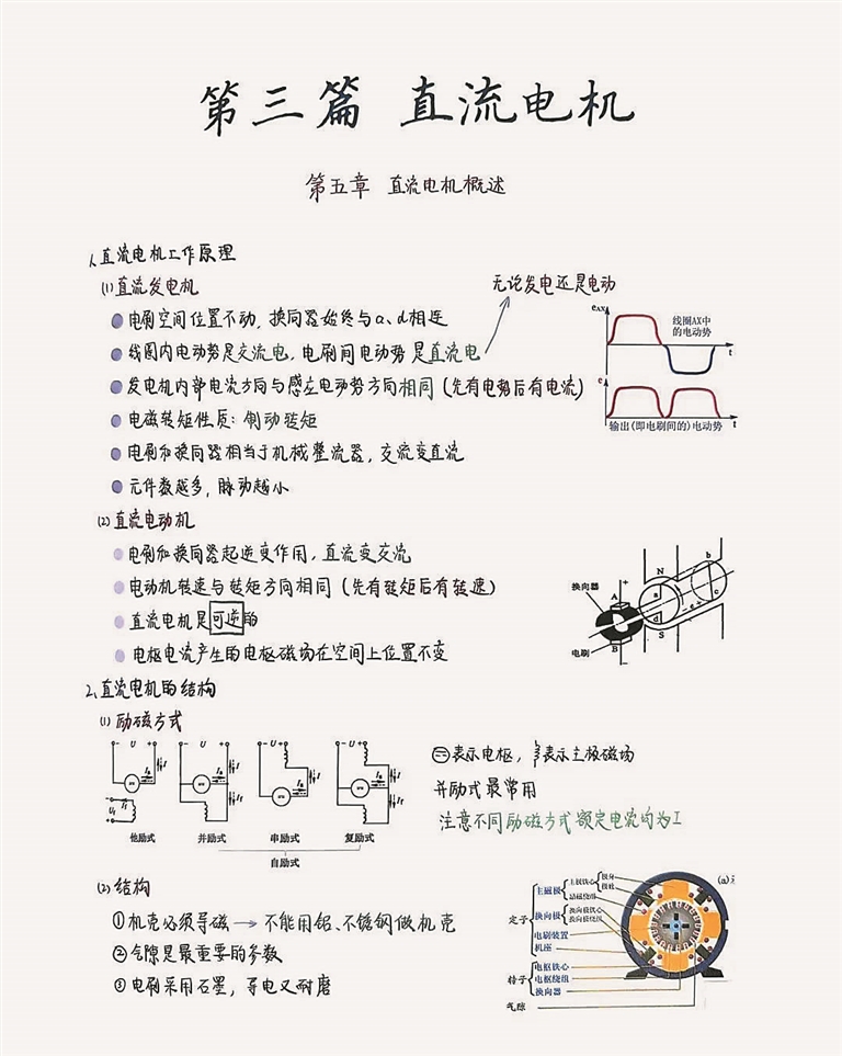 起初,我只是机械地抄写公式和定理,但后来发现,真正有效的笔记是经过消化后的输出——用简洁的语言重述原理,用图表解析抽象概念,用例题验证理解,这个过程让我对电机特性等复杂理论有了更直观的认识。学习电机学的过程就像拆解一台精密的机器,笔记形成了知识框架,能帮我形成系统的学习路径。复习时,这些结构也会成为我的“故障诊断手册”。