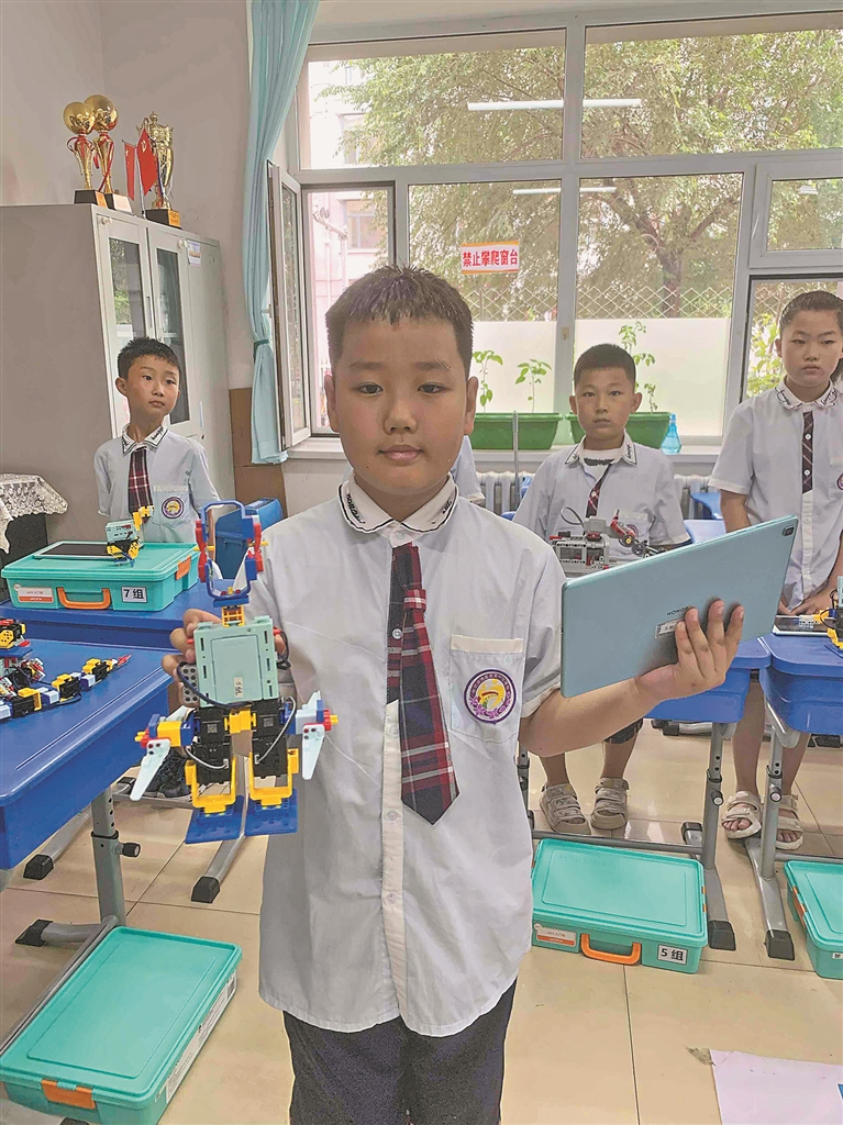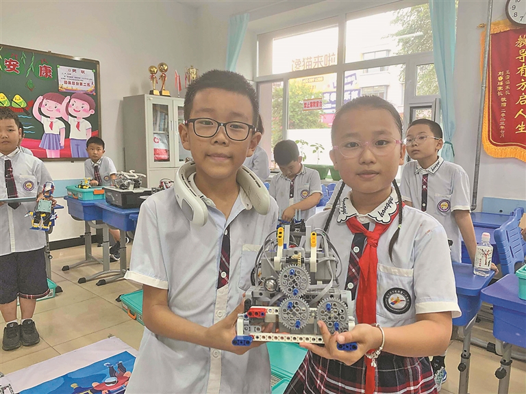 “这个是我设计制作的跳舞机器人。”三年二班孙文昊说:“我每周上一节人工智能第二课堂课,我用了一个学期设计了跳舞机器人,可以抬腿,上下摇摆,你看,随着七彩阳光的音乐,机器人还会做广播体操。”三年十二班姜林泽和三年二班徐奕承也联合设计了一款跳舞机器人,“这款机器人可以金鸡独立,跳起舞来刚劲有力,你看,随着男儿当自强的音乐它舞起来了。”
