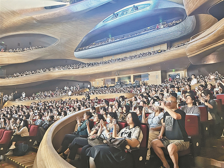 记者看到,还有不少观众要为首演场的两位女演员“站起来鼓掌”,“张会芳饰演的‘卢淑娟’嗓音像珍珠一样轻柔,同时又把疑惑、坚韧、仰慕这些细腻情绪揉进歌里,太妙了。蔡忻如饰演的‘柳絮影’声线圆润、高亢优美,让我穿越到孩子们喜欢的《冰雪奇缘》。尤其是中后段的一段独唱直接让我破防,情绪像山洪一样冲出来,把‘在绝望中活下去’这件事唱得太有力量了。”