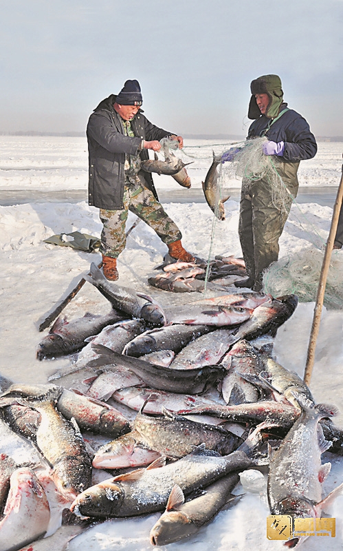 冰层下,憋了整个寒冬的鱼群在浮起的碎冰间争相露头,等在一旁的振仁早已抄起搅箩,一兜下去,连鱼带冰提上来扣倒在冰面上。我则一脚踩住平铺在冰面上的麻袋底边,撑圆了口子,挥着手臂把仍在跳动挣扎的鲜鱼扫进袋内。我们配合默契,动作一气呵成,渔获悉数入袋,冰窟里的水也由上而下再次冻结,仿佛这场热闹从未发生。