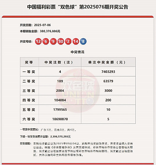 6日,福彩双色球第2025076期迎来开奖,本期中出一等奖4注,具体中奖情况:广东1注、云南3注。本期销量3.80亿元,奖池金额23.96亿元,筹集公益金1.36亿元。