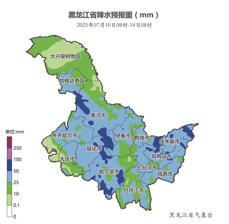 预计全省10-13日自西向东有中到大雨,局地有暴雨,累计降水量大兴安岭南部、黑河中南部、伊春大部、齐齐哈尔中北部、绥化、大庆北部、哈尔滨大部、鹤岗、佳木斯、双鸭山、七台河、鸡西、牡丹江大部25~50毫米,局地可达55~75毫米,其他地区3~25毫米。降水同时伴有短时强降水、雷暴大风、冰雹等强对流天气,最大小时降水量40~60毫米。另外,10-11日大部地区气温持续较高,南部和东部地区最高气温可达31~35℃。