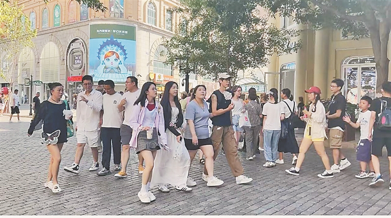 午后的阳光洒在中央大街的面包石路面上,空气中浮动着温热的气息。游人如织,却不见他们的步履焦躁匆忙。记者看到,三五成群的市民、游客悠闲地踱着步;一位老先生坐在长椅上,不紧不慢地摇着蒲扇;年轻女孩们举着手机,以身后的百年老店为背景自拍,清脆的笑声不时响起;最欢腾的是孩子们,小手紧握马迭尔冰棍,满足地品尝着。