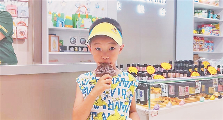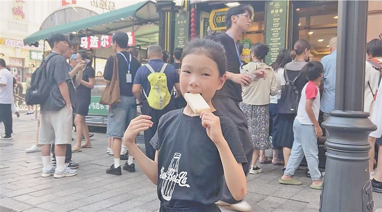 “这里比青岛凉快多啦!”一个扎着小辫、名叫朵朵的小女孩兴奋地对记者说。她是从青岛来哈尔滨参加研学活动的,“这里的人非常热情,中央大街好热闹,我特别喜欢这里!”另一边,一个被姥姥、姥爷牵着手的小女孩,脸蛋红扑扑的,正努力地吸吮着一根快化了的奶油冰棍。“姥姥给我买了马迭尔冰棍解暑。”这个名叫小玉米的女孩奶声奶气地说,“这冰棍特别好吃!”她的姥爷在一旁笑着补充:“孩子就馋这一口,天热点儿怕啥,吃得开心就好。”